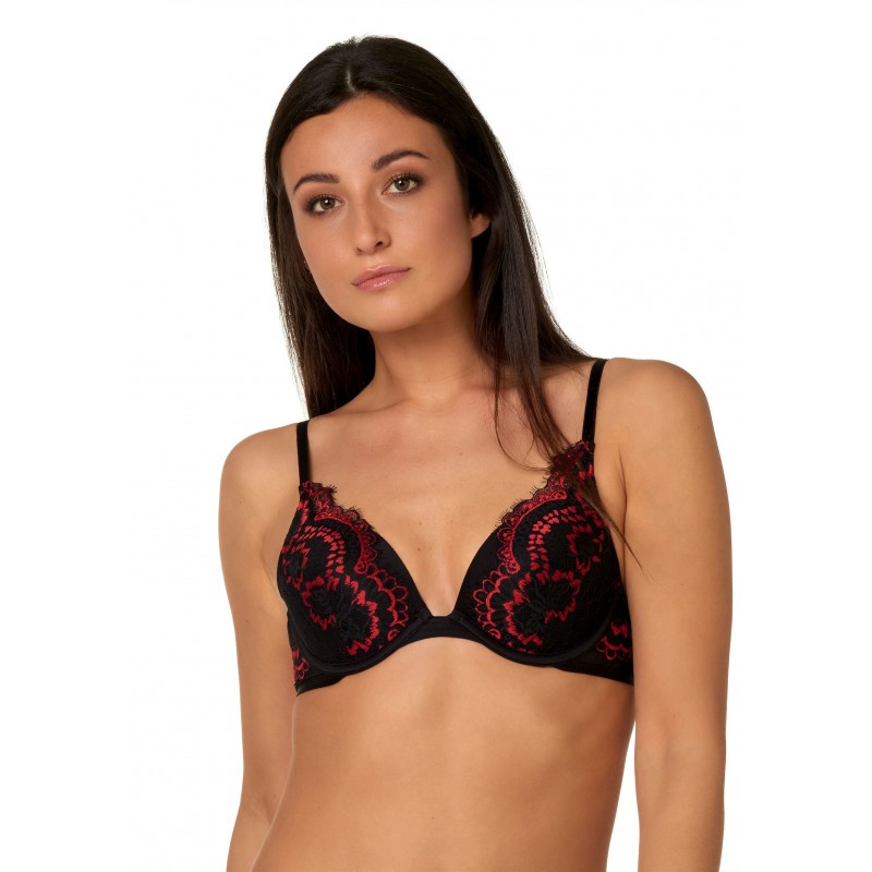 Γυναικείο σουτιέν εξαιρετικής εφαρμογής με ήπια ενίσχυση και μπανέλα . Αισθησιακό σχέδιο με διχρωμία στη δαντέλα . Μοναδικός συνδυασμός ,μαύρο με κόκκινο ,συνδυάζεται τέλεια με τα εσώρουχα της ίδιας σειράς .Διαθέτει λεπτά ραντάκια και βαθύ ντεκολτέ. Υπόσχεται άνεση όλη μέρα με τέλειο κράτημα και παράλληλα σας χαρίζει απόλυτο θηλυκό απότελεσμα . Καλύπτει cups B & C .