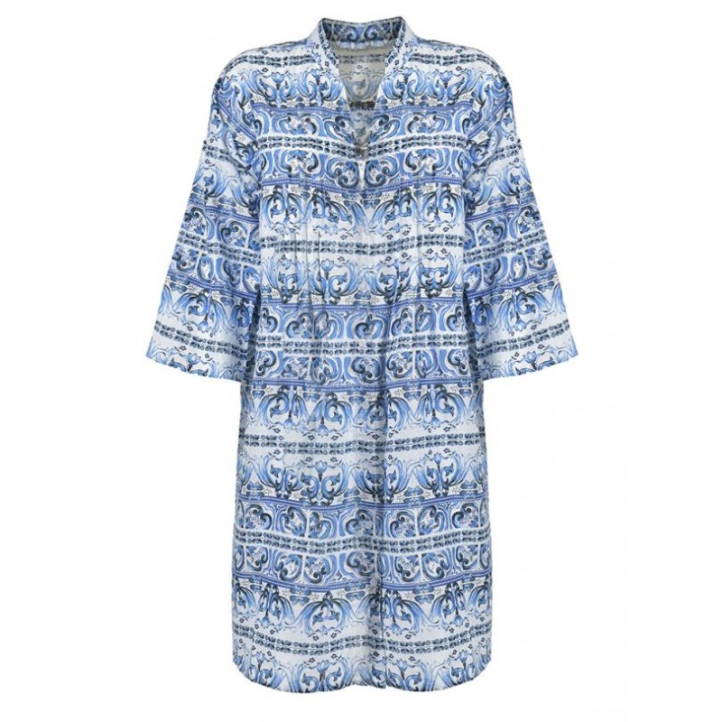Ble Γυναικεία Πουκαμίσα - Καφτάνι Με Τρουακάρ Μανίκι Σε Μπλε - Λευκό Χρώμα Με Σχέδια