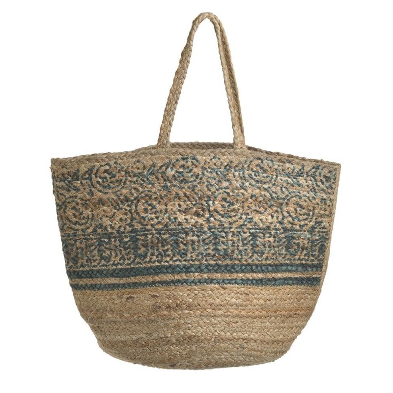 Ψάθινη τσάντα σε άνετο μέγεθος,διακοσμημένη με όμορφα σχέδια στις αποχρώσεις του πράσινου.