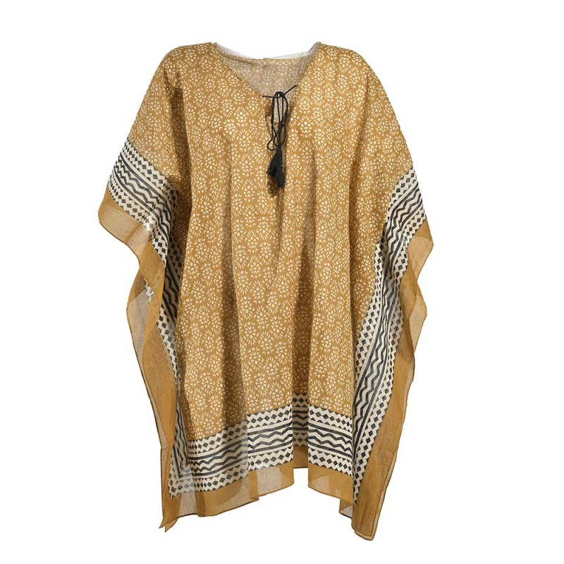 Ble Γυναικείο Καφτάνι Κοντό Βαμβακερό Σε Μουσταρδί Χρώμα Με Σχέδια
