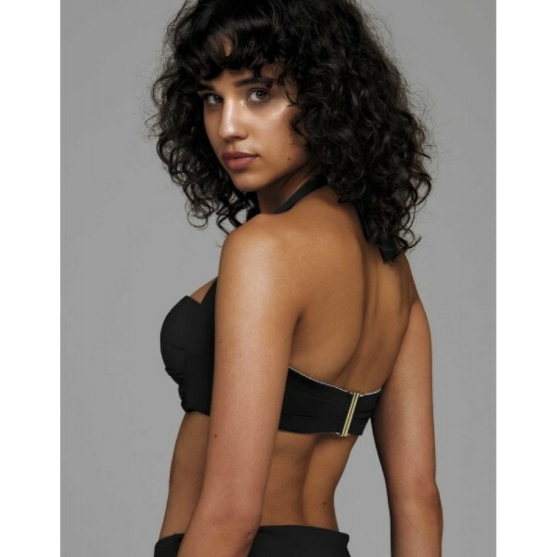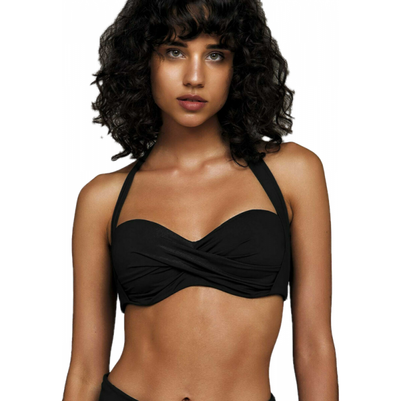 Μαγιό με ενίσχυση και περιμετρική στήριξη μπανέλας. Άριστο κράτημα για μεγάλο στήθος. Λωρίδες σιλικόνης και σταθερό κούμπωμα πίσω. Λιτή fashion γραμμή με πλισέ σχέδιο και φαρδιές λωρίδες που δένουν στον λαιμό. Τεχνολογία χωρίς ραφές μπροστά. Συνδυάζεται με τα μονόχρωμα και εμπριμέ Μαγιό σλιπ της σειράς.