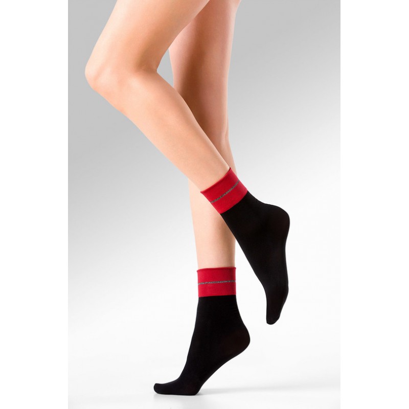 Gabriella καλτσάκι σοσόνι σε μαύρο χρώμα με κόκκινη φάσα στο τελείωμα & σχέδιο από lurex και χρυσόσκονη . Διαθέτει πολύ μαλακό λάστιχο , opaque υφή κα..