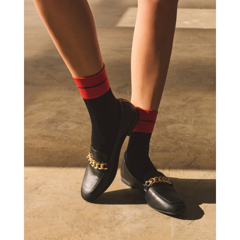 Gabriella καλτσάκι σοσόνι σε μαύρο χρώμα με κόκκινη φάσα στο τελείωμα & σχέδιο από lurex και χρυσόσκονη . Διαθέτει πολύ μαλακό λάστιχο , opaque υφή και εφαρμόζει εξαιρετικά . Η τέλεια πινελιά για να συμπληρώσετε την εμφάνιση σας .