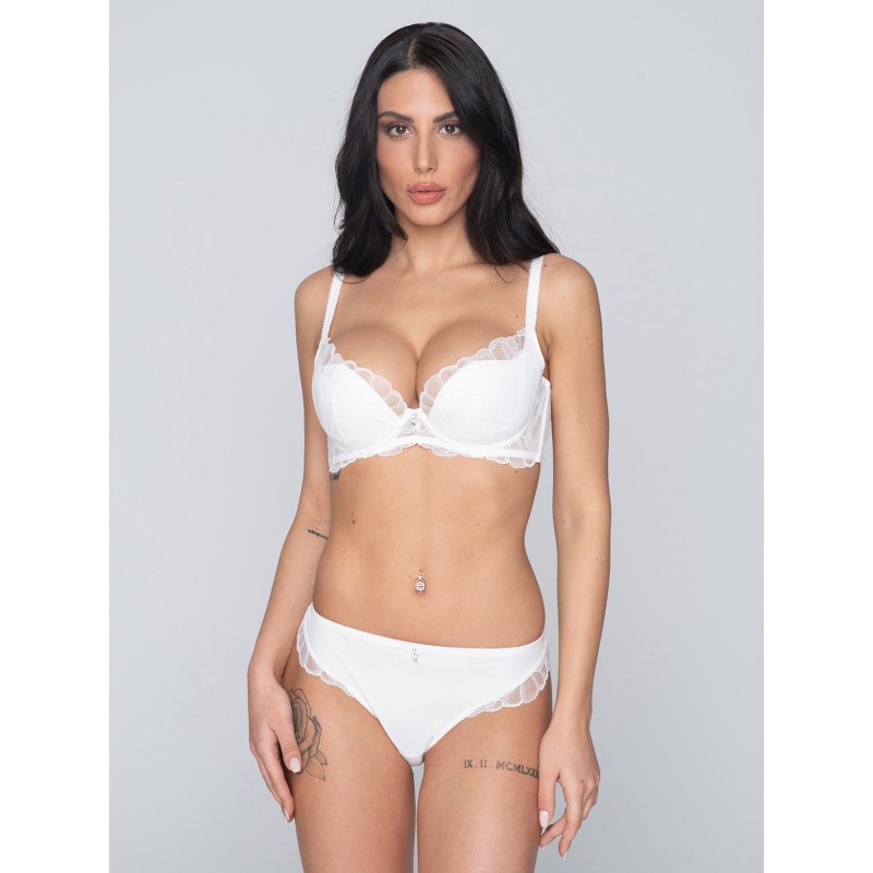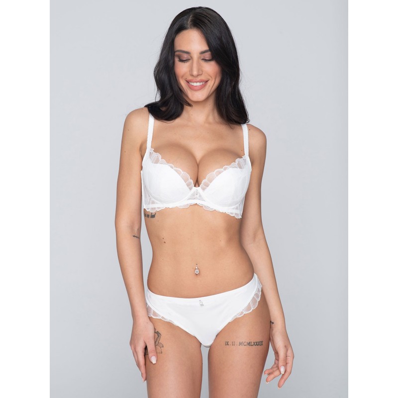 Εντυπωσιακό σουτιέν με ήπια ενίσχυση,μπανέλα σε balconette γραμμή,που αναδεικνύει το στήθος με τον καλύτερο τρόπο!Μπορείτε να το συνδυάσετε με τα εσώρουχα της ίδιας σειράς ,ζαρτιέρα και καλτσοδέτα.Αποτελεί εξαιρετική νυφική πρόταση.