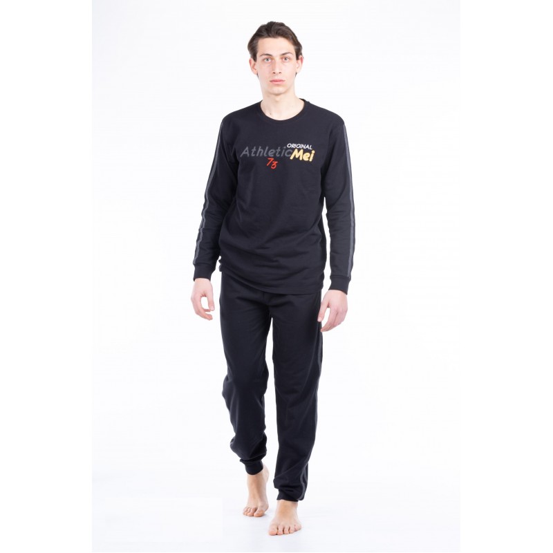MEI Ανδρική Πυζάμα φούτερ 100% βαμβακερό ύφασμα,εξαιρετικής ποιότητας .Μονόχρωμο παντελόνι, μπλούζα με τύπωμα και λάστιχο στα τελειώματα. Μια επιλογή από ενισχυμένο βαμβάκι για τις κρύες ημέρες του χειμώνα.