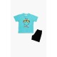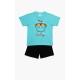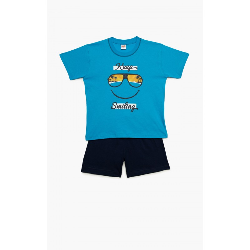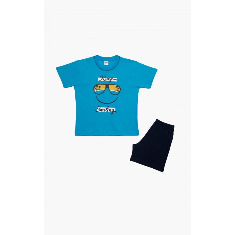 Παιδικό θερινό πυτζαμάκι για αγόρι από 100% απαλό βαμβακερό ύφασμα υψηλής ποιότητας. Το σετ περιλαμβάνει κοντομάνικη μονόχρωμη μπλούζα με στρογγυλή λαιμόκοψη, τύπωμα και μονόχρωμη βερμούδα με ελαστική μέση.