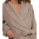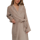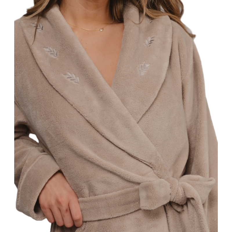 Super soft fleece ρόμπα με γιακά ,τσέπες και ζώνη της εταιρείας Mira .Εξαιρετικής ποιότητας με αφράτη πλέξη , πολύ ζεστή και αρχοντική ,σε μπεζ χρώμα και κέντημα στο γιακά