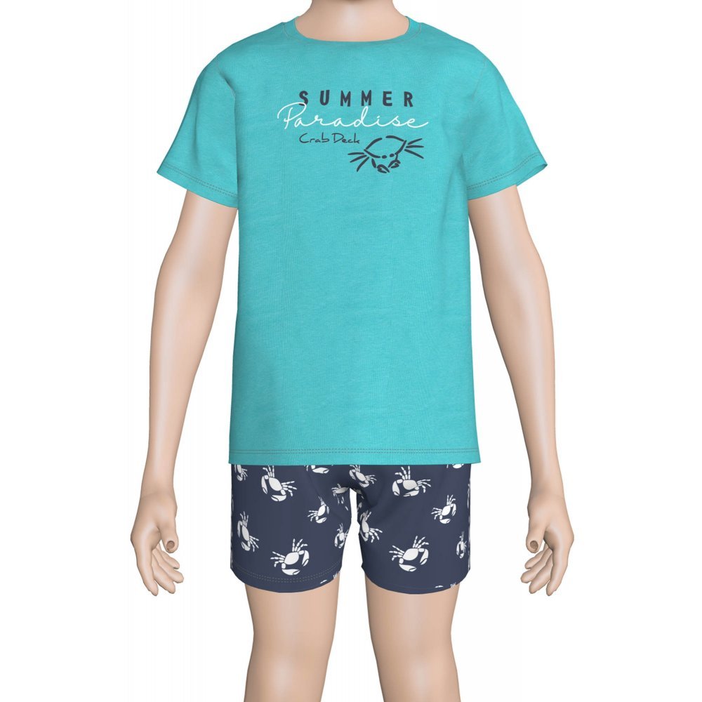 Παιδικό θερινό πυτζαμάκι για αγόρια από 100% βαμβακερό ύφασμα υψηλής ποιότητας . Το σετ περιλαμβάνει κοντομάνικο μπλουζάκι με στρογγυλή λαιμόκοψη και σορτς . Διαθέτει λεπτομέρειες και χαριτωμένα τυπώματα που σίγουρα θα λατρέψουν μικροί και μεγάλοι .